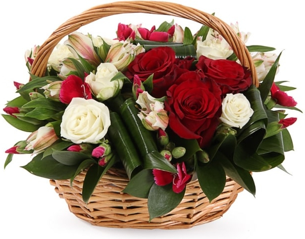 5 красных роз, 6 белых роз, 7 альстромерий, зелень, оазис, корзина7 красных роз, 8 белых роз, 8 альстромерий, зелень, оазис, корзина